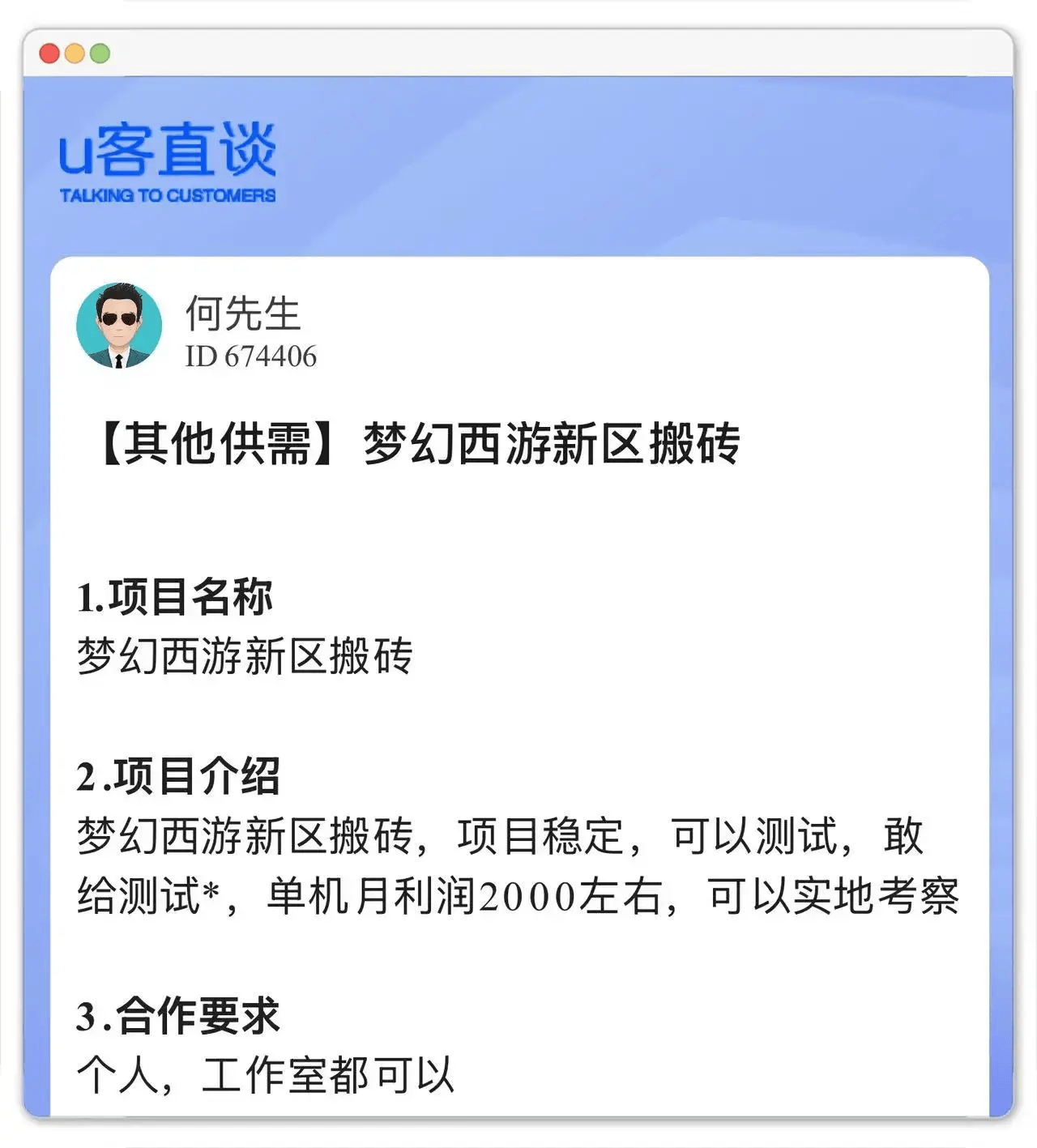 像是U客直谈这类国内规模领先的资源整合平台,上面提供了大量游戏工作室招商信息,都来自于真实需求,能够帮助我们了解哪些游戏值得投入,比自己盲目瞎找靠谱多了。