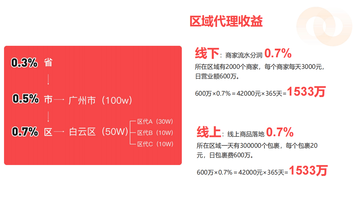 有意深耕本地市场的伙伴可成为区县代理,需缴纳一定的平台使用费,负责区域内商家与商务的日常服务与支持。代理可享有本区域内所有营业额的0.7%作为服务费,这一收益不仅覆盖线下交易,线上商品包裹同样计入,长期经营下年收益有望达到千万元量级,是一条可持续的“管道型”财富路径。