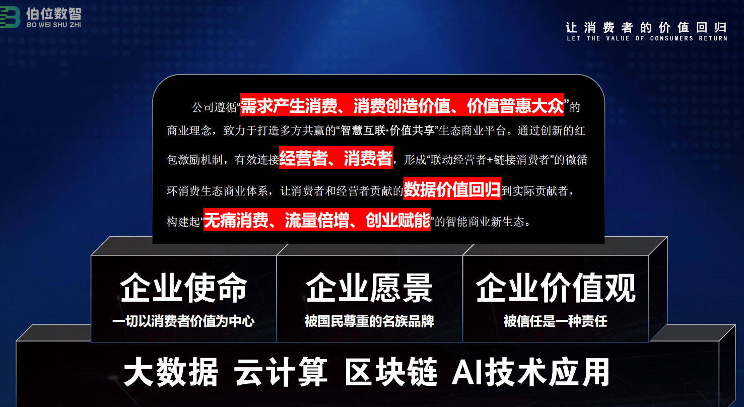 “伯位数智”,是一家以重构商业关系为核心的数字智慧平台,其最具突破性的主张,是提出“让消费者的价值真正回归本位”的全新生态理念。在这一视角下,消费者不再只是单向付出金钱的“购买方”,而是被重新定义为商业循环中可参与价值共享的关键角色。