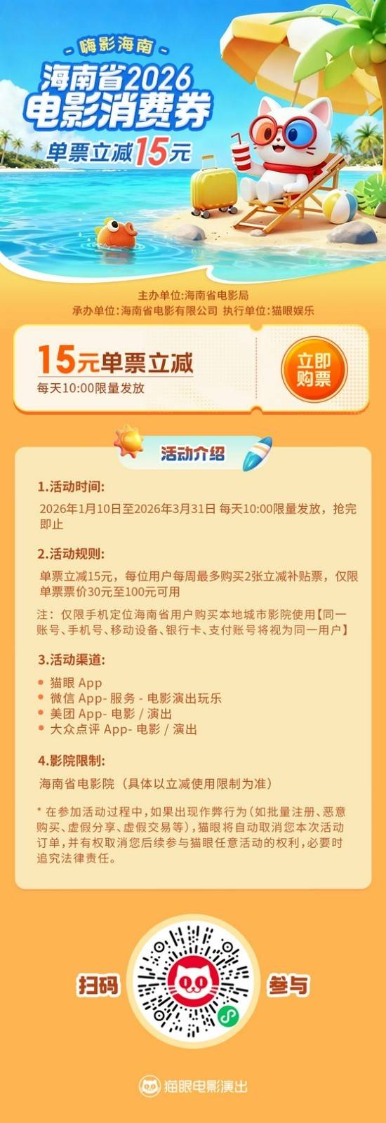 此次惠民活动将采用单票立减的形式,每日向海南用户发放观影福利。活动期间,每天上午10:00将限量开启补贴通道,市民在购买电影票时有机会享受“单票立减15元”的优惠。