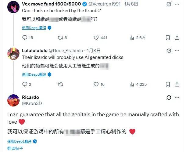 起因是一位网友玩笑式地猜测,新作中蜥蜴人角色的私密部位可能会使用AI生成。对此,Ricardo承诺道:我保证游戏中所有的私密部位都将是纯手工打造的。