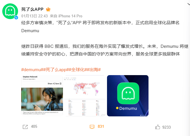 1月13日晚间,近期大火的独居安全APP“死了么”官方宣布,将于即将发布的新版本中,正式启用全球化品牌名 Demumu。