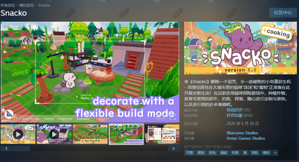 今天推荐一款以猫咪为主角的农场模拟经营游戏,《Snacko(猫岛物语)》。
