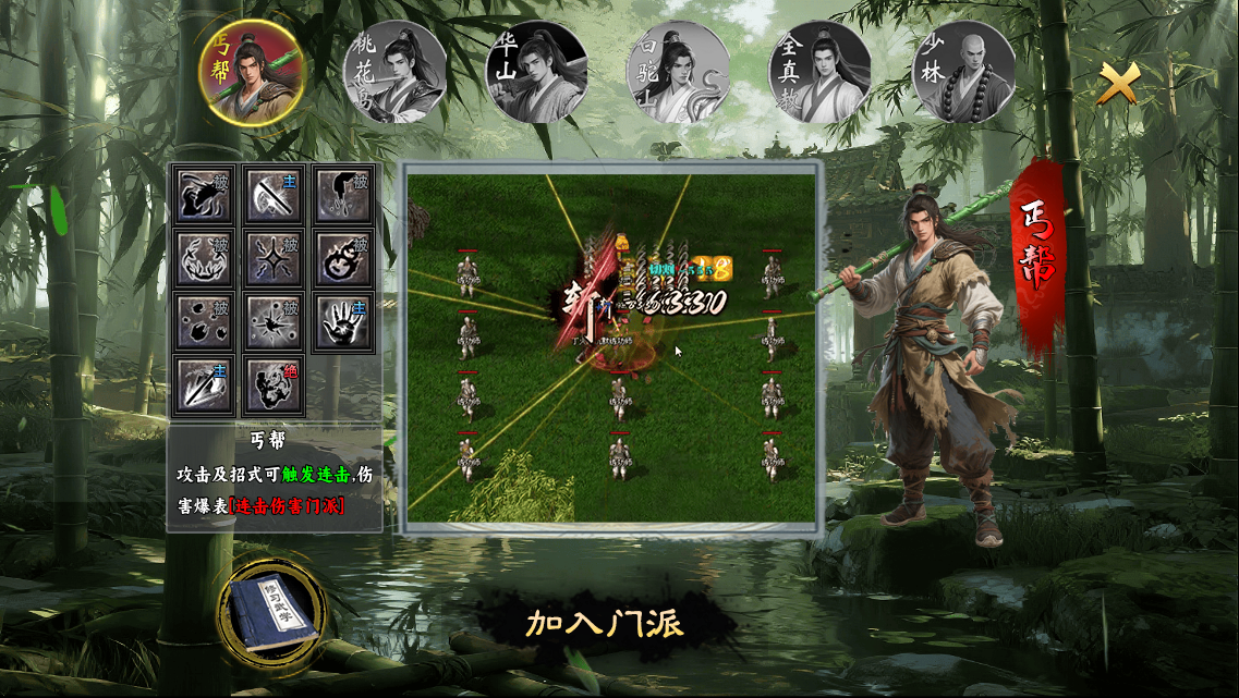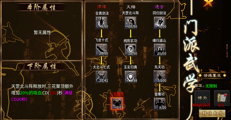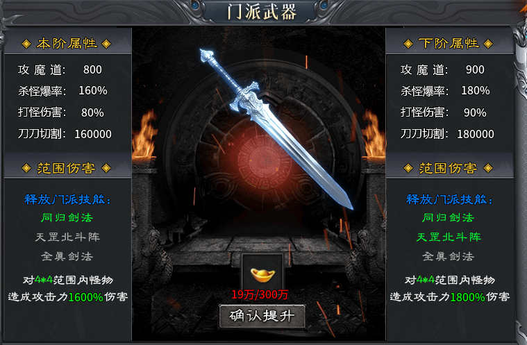 门派不仅加攻魔道、爆率、怪伤、切割,还能强化三个门派武学,使其附带范围伤害。等级越高,能解锁的范围武学越多。