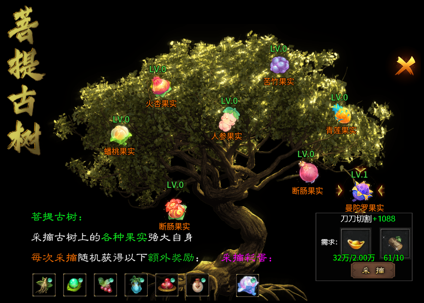 菩提古树更是个“属性加油站”,消耗元宝和乌木摘果实,能强化切割、BOSS增伤、爆率等属性,每种果实*多摘50次,每次摘还能得个概率提升效果的道具。*香的是采摘彩蛋,胜利的果实,永久加5%切割倍数和20%打怪伤害,每人只能用一次,摘200次必出,相当于给勤奋玩家发了个“永久增益券”,很有吸引力。