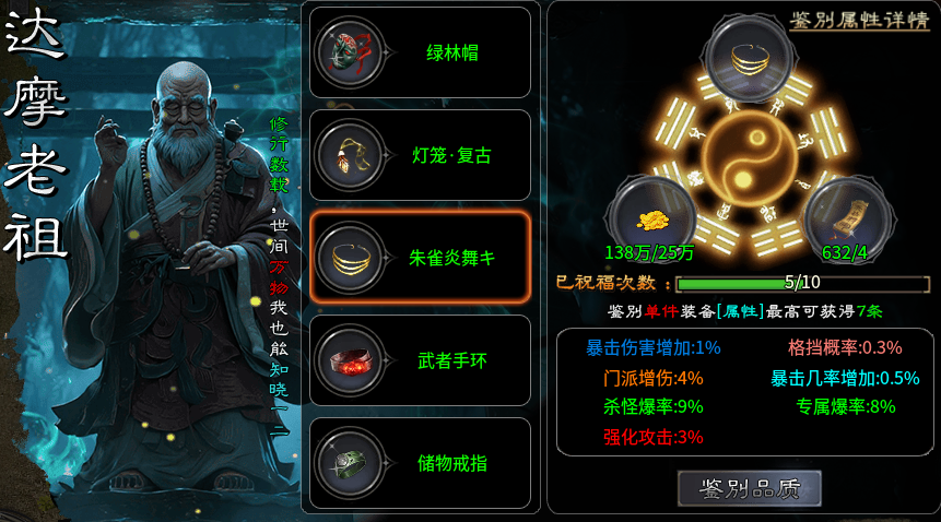 专属鉴定更刺激,三大陆以上专属装备找达摩老祖鉴定,消耗金币和鉴定符,*多能出7条属性词条。品质从普通到传奇,传奇品质必出全门派增伤,鉴定10次还必出传奇!杀怪爆率、打怪伤害、暴击几率这些实用属性,全靠鉴定堆出来,欧皇和非酋的差距,就在这几次鉴定里拉开。