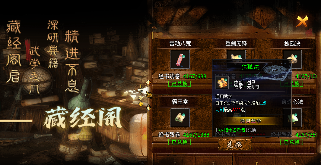 通用武学也不弱,大陆任务和活动能拿,还能找无名老僧用经书残卷换。优先换独孤决,带刷怪加切割,前期发育必备,获得后双击背包就能装备,方便得很。