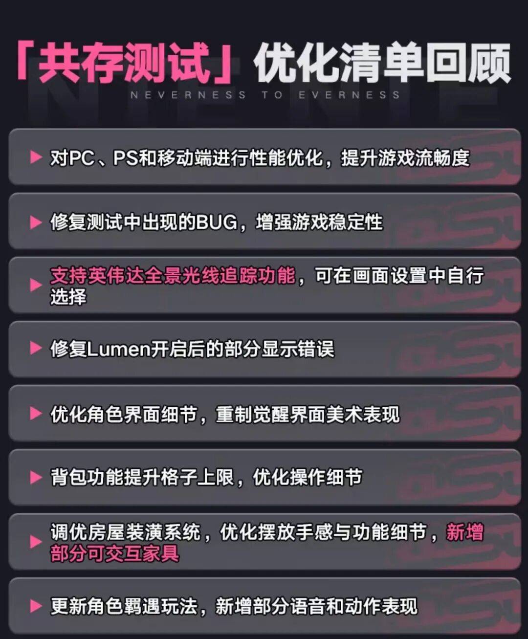 比如从游戏首次曝光起,他们在游戏本身框架稳步完善拓展的同时,也会兼顾玩家的建议或意见。每次测试的总结环节中列举的调整计划,基本都能在下个版本中一一实装。